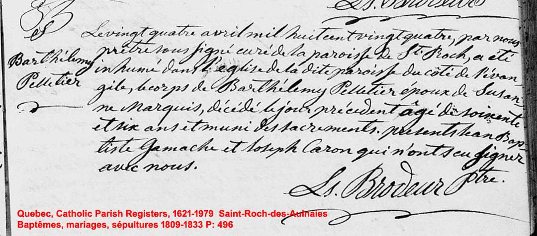 La Branche de Barthelemy Pelletier N*1758 D*1824 Marié à Suzanne Marquis N*1763 M*1785 D*1842 Ascendants |