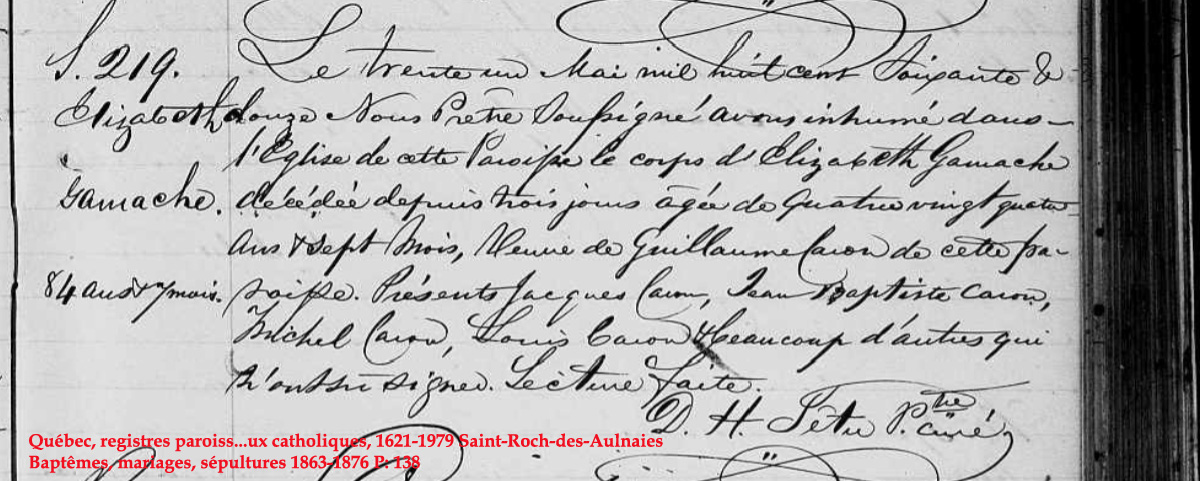 La Branche de Élisabeth Gamache N*1788 D*1872 Mariée à Guillaume Caron N*1780 M*1812 D*1849 Ascendants |