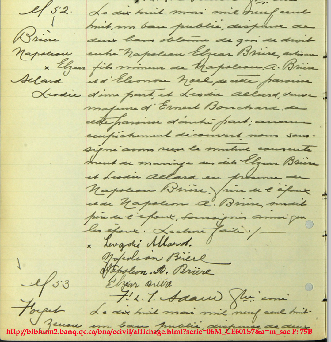 La Branche de Elzéar-Napoléon Brière N*? D*? Marié à Juliette-Élodie Allard N*? M*1908 D*? Ascendants |