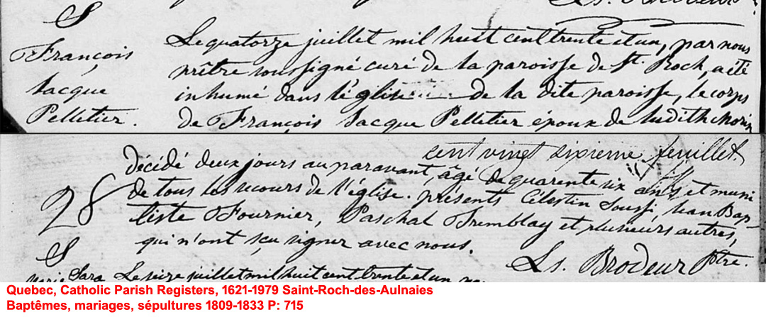 La Branche de François-Jacques Pelletier N*1786 D*1831 Marié à Marie-Judith Morin N*1795 M*1816 D*1863 Ascendants |