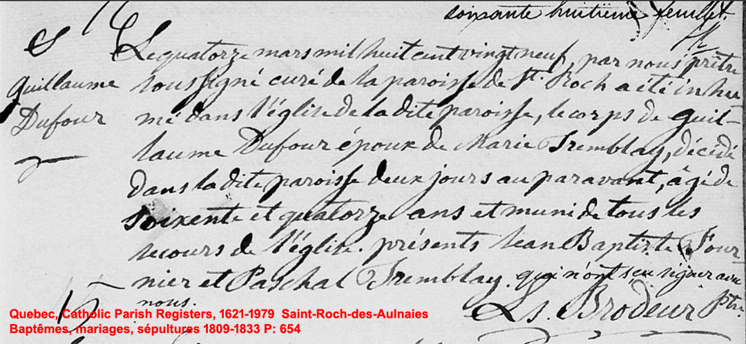 La Branche de Guillaume-Marc Dufour N*1763 D*1829 Marié à Marie Tremblay N*1762 M*1782 D*1846 Fils de Gabriel Dufour et Geneviève Tremblay de l'Ile-aux-Coudres, Québec. |