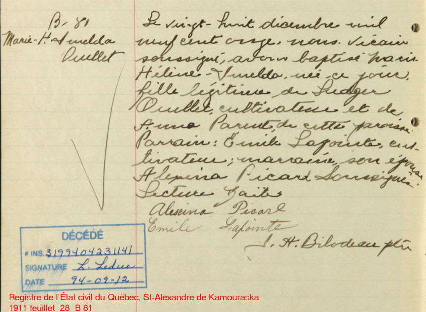 La Branche de Hélène Ouellet N*1911 D*1994 Mariée à Arthur Landry N*1909 M*1934 D*1996 Fille de Ludger Ouellet et Anna Parent de St-Alexandre de Kamouraska, Québec. |