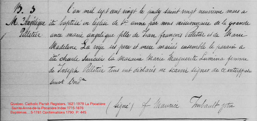 La Branche de Jean-François Pelletier N*1684 D*1743 Marié à (1) Marie-Madeleine Lavoie N*1691 M*1710 D*1721 Marié à (2) Marie-Madeleine Morin N*1697 M*1722 D*1760 Ascendants |