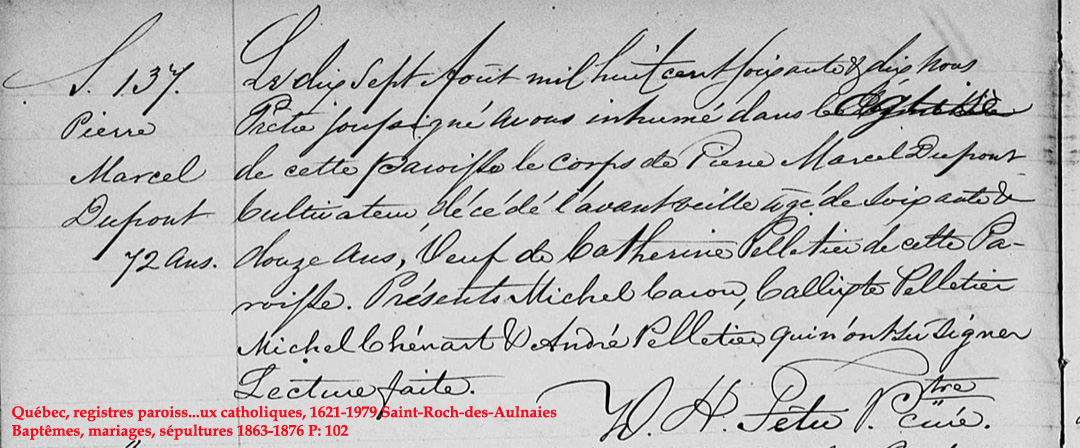 La Branche de Marcel Dupont N*1798 D*1870 Marié à Catherine Pelletier N*1797 M*1828 D*1865 Fils de Charles-François Dupont et Marguerite Mercier de St-Jean-Port-Joli, Québec. |