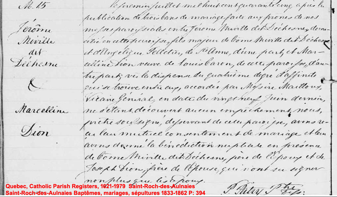 La Branche de Marcelline Dion N*1809 D*? Mariée à (1) Louis Caron N*1800 M*1829 D*? Mariée à (2) Jérome Miville Deschênes N*1820 M*1845 D*? Ascendants |