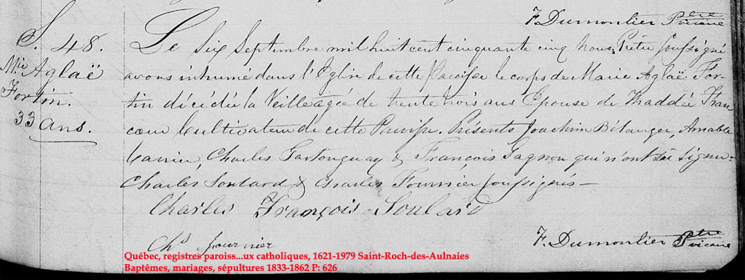 La Branche de Marie-Aglaé Fortin N*1822 D*1855 Mariée à Thaddée Leclerc N*1824 M*1846 D*? Ascendants |