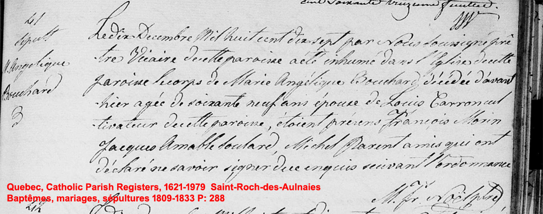 La Branche de Marie-Angélique Bouchard N*1749 D*1817 Mariée à Louis-Marie Caron N*1746 M*1769 D*1825 Fille de Jacques Bouchard et Françoise Rousset de l'Iles-aux-Coudres, Québec. |