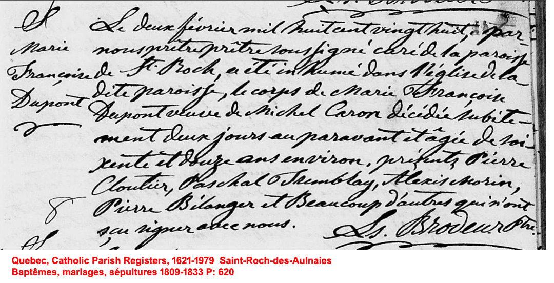 La Branche de Marie-Françoise Dupont N*1756 D*1828 Mariée à Michel Caron N*1757 M*1781 D*1804 Fille de Jacques Dupont et Marie-Louise Brisson de St-Roch-des-Aulnaies, Québec. |