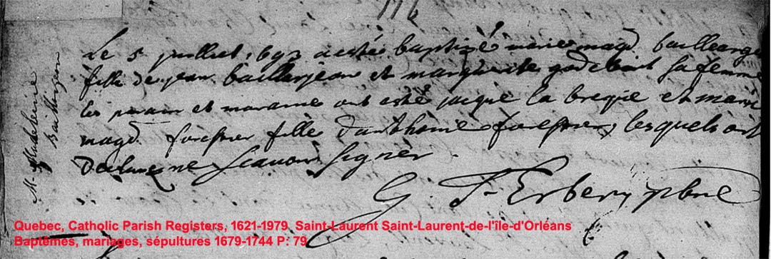 La Branche de Marie-Jeanne Godbout N*1665 D*1732 Mariée à (1) Jean Baillargeon N*1659 M*1683 D*1694 Mariée à (2) René Pelletier N*1659 M*1703 D*1713 |