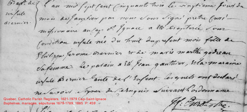 La Branche de Marie-Ursule Bernier N*1753 D*1804 Mariée à François-Marcel Bernier N*1753 M*1772 D*1823 Fille de Philippe Bernier et Marthe Gaudreau de Cap St-Ignace, Québec. |