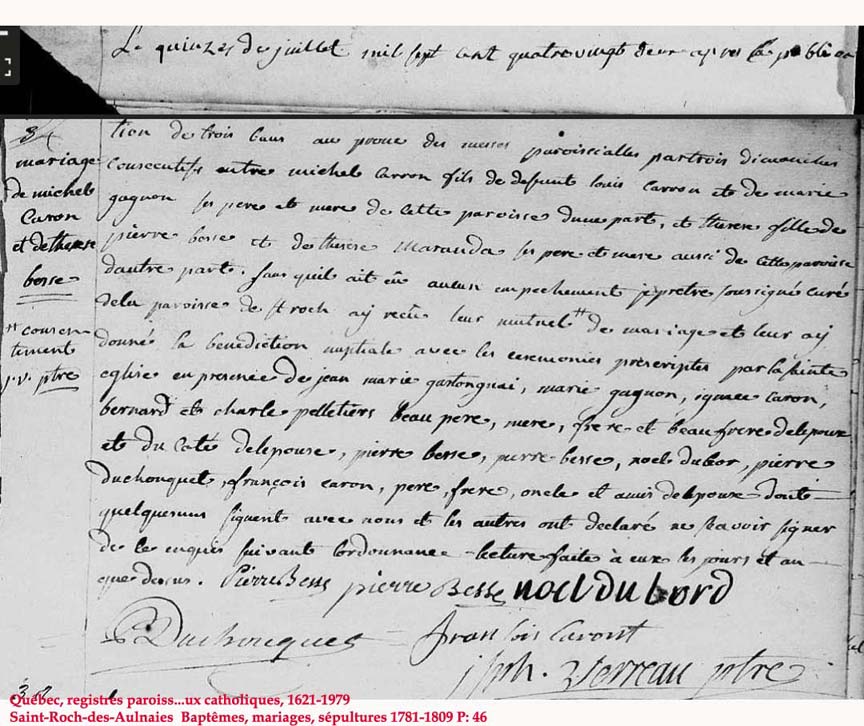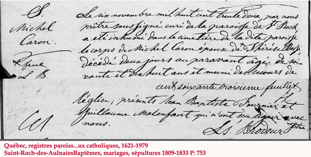 La Branche de Michel Caron N*1754 D*1792 Marié à Thérèse Besse N*1759 M*1782 D*1825 Ascendants |