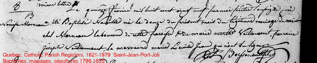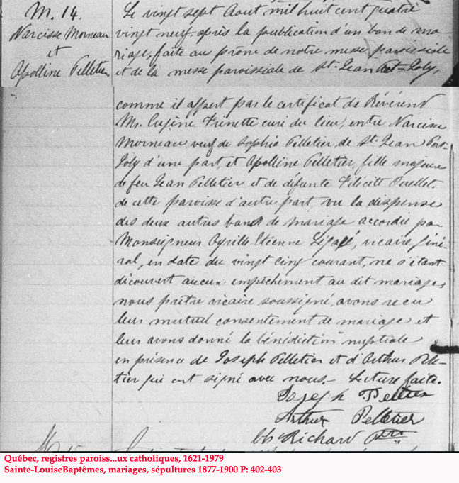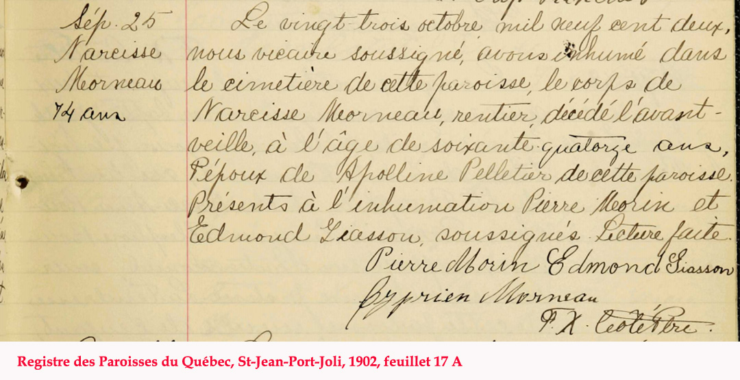 La Branche de Narcisse Morneau N*1829 D*1902 Marié à (1) Clémentine Carrier N*1831 M*1848 D*1875 Marié à (2) Sophie Pelletier N*1836 M*1878 D*1888 Marié à (3) Apolline Pelletier N*1838 M*1889 D*1902 Ascendants |