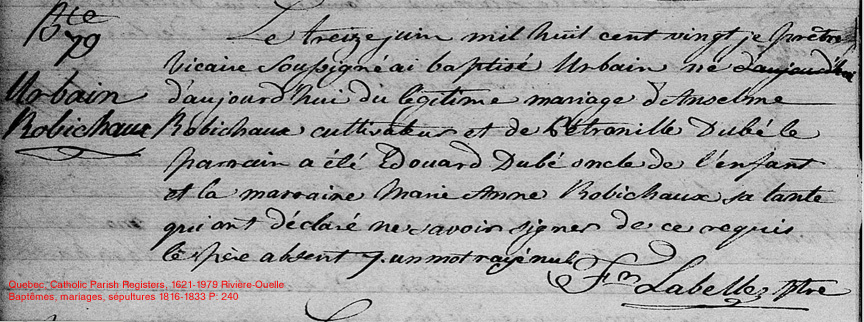 La Branche de Urbain Robichaud N*1820 M*1845 D*1900 Marié à Théotiste Potvin N*1821 M*1845 D*1876 Ascendants |