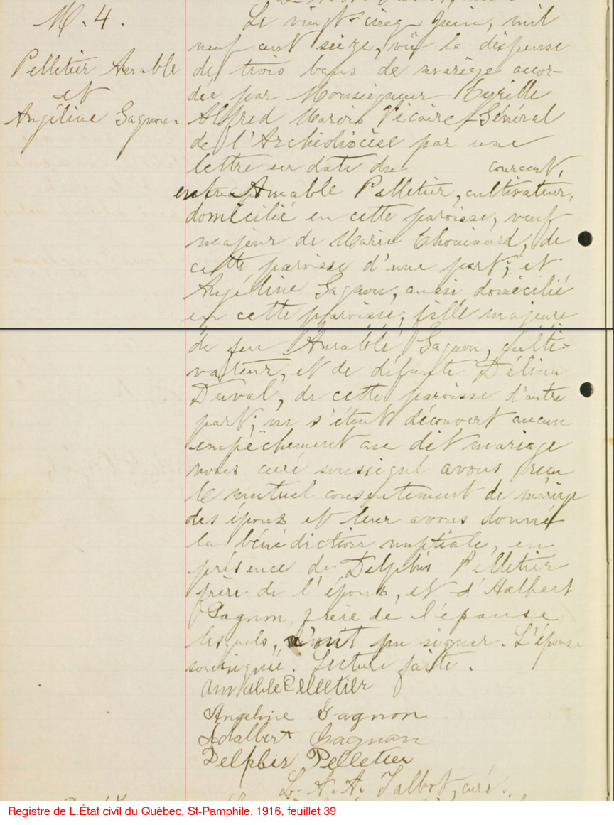 La Branche de Amable Pelletier N*1883 D*1948 Marié à (1) Marie Chouinard N*1880 M*1904 D*1915 Marié à (2) Angéline Gagnon N*1890 M*1916 D*1986 Ascendants |