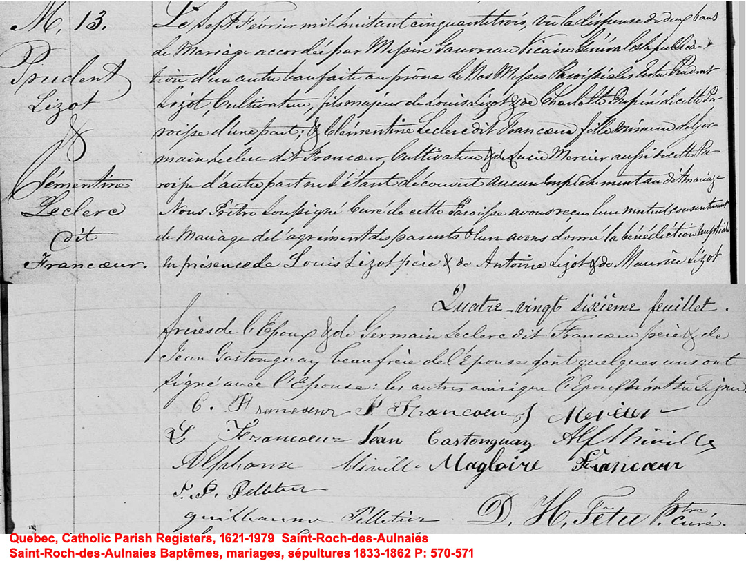 La Branche de Clémentine Leclerc N*1835 D*1914 Mariée à Pierre-Prudent Lizotte N*1824 M*1853 D*1915 Ascendants |