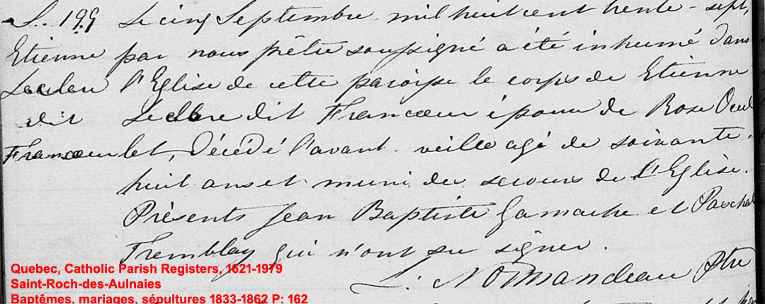 N*1789 D*? Marié à (1) Josephte Dessaint N*1792 M*1811 D*1820 Marié à (2) Thérèse Deladurantaye N*1800 M*1821 D*? |