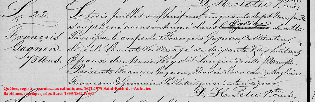La Branche de François Gagnon N*1779 D*1857 Marié à (1) Marie-Cécile Drugeot N*1776 M*1806 D*1811 Marié à (2) Charlotte Dubé N*1791 M*1812 D*1816 Marié à (3)Marguerite Bélanger N*1798 M*1817 D*1830 Marié à (4) Marie Roy N*1792 M*1831 D*1857 Ascendants |