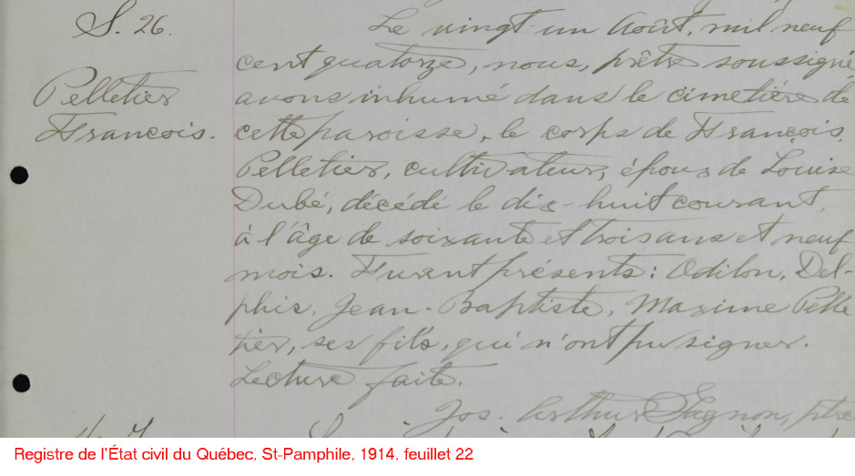 N*1871 D*1942 Marié à (1) Amanda Pelletier N*1875 M*1897 D*1908 Marié à (1) Laura-Dora Pelletier N*1887 M*1909 D*1931 |