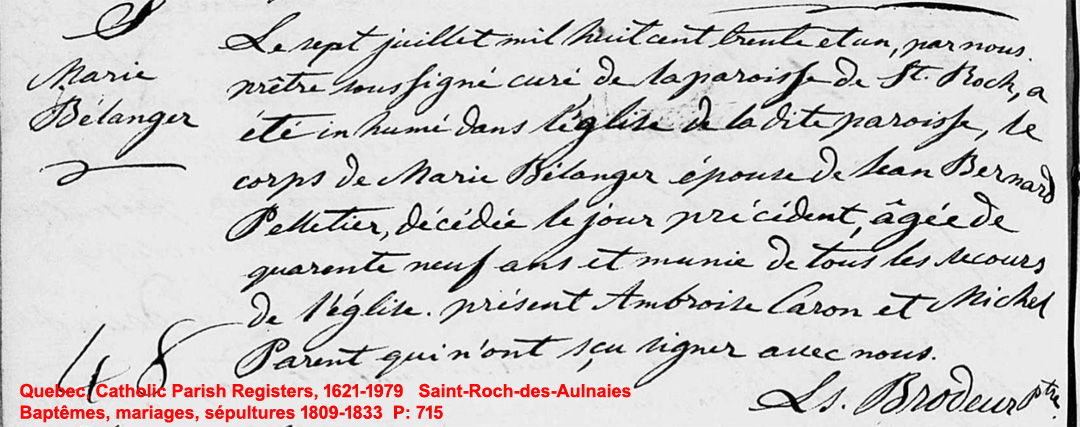 La Branche de Marie-Geneviève Bélanger N*1783 D*1831 Mariée à Jean-Bernard Pelletier N*1771 M*1799 D*1849 Fille de Jean-Baptiste Bélanger et Chlotilde Rousseau de L'Islet. |