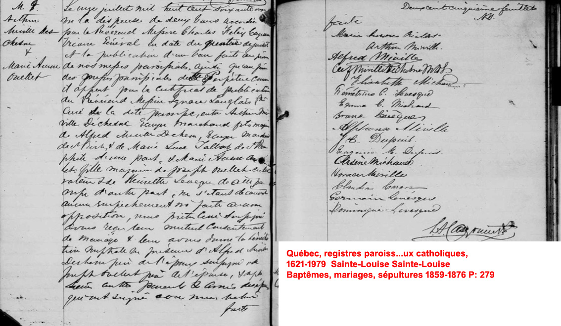 La Branche de Marie-Aurore Ouellet N*1847 D*1901 Mariée à Alphonse-Arthur Miville Déchêne N*1848 M*1871 D*1902 Fille de Joseph-Côme Ouellet et Henriette Lévesque. |