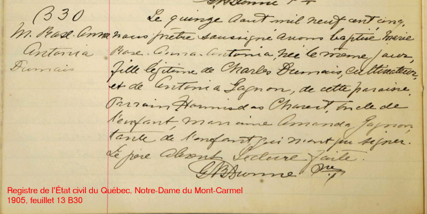 La Branche de Marie Dumais N*1905 D*1962 Mariée à Arthur Roussel N*1900 M*1924 D*2001 Fille de Charles Dumais et Antonia Gagnon de Mont-Carmel de Kamouraska, Québec. |