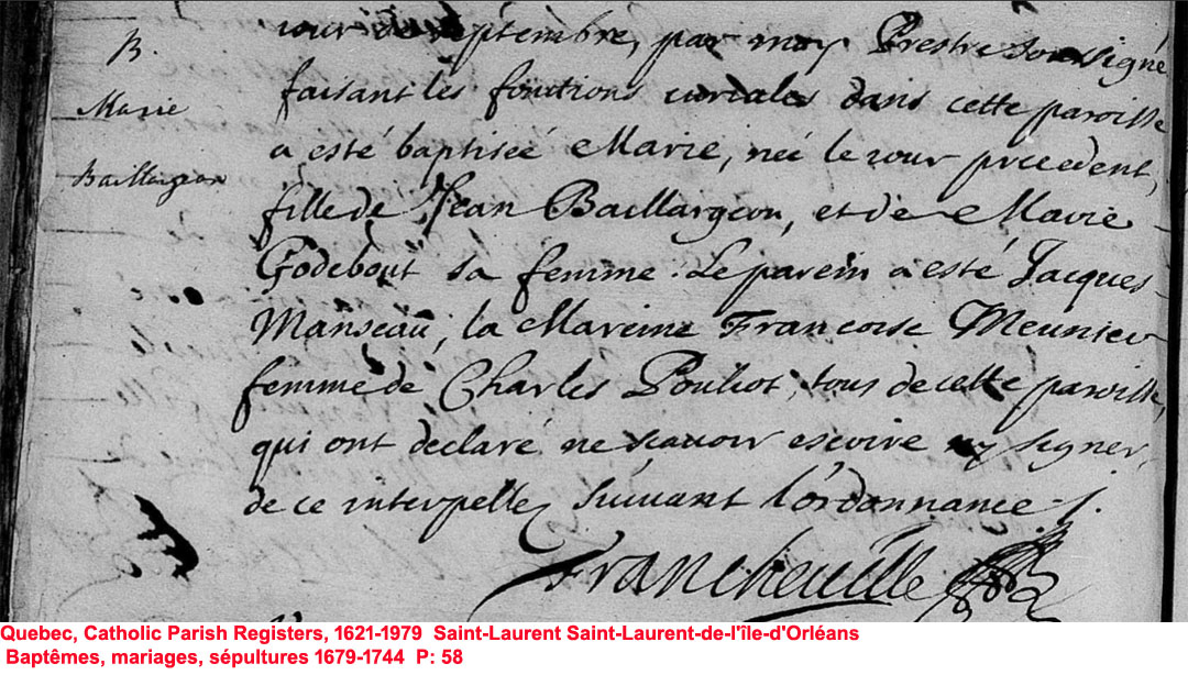 La Branche de Marie-Jeanne Godbout N*1665 D*1732 Mariée à (1) Jean Baillargeon N*1659 M*1683 D*1694 Mariée à (2) René Pelletier N*1659 M*1703 D*1713 |