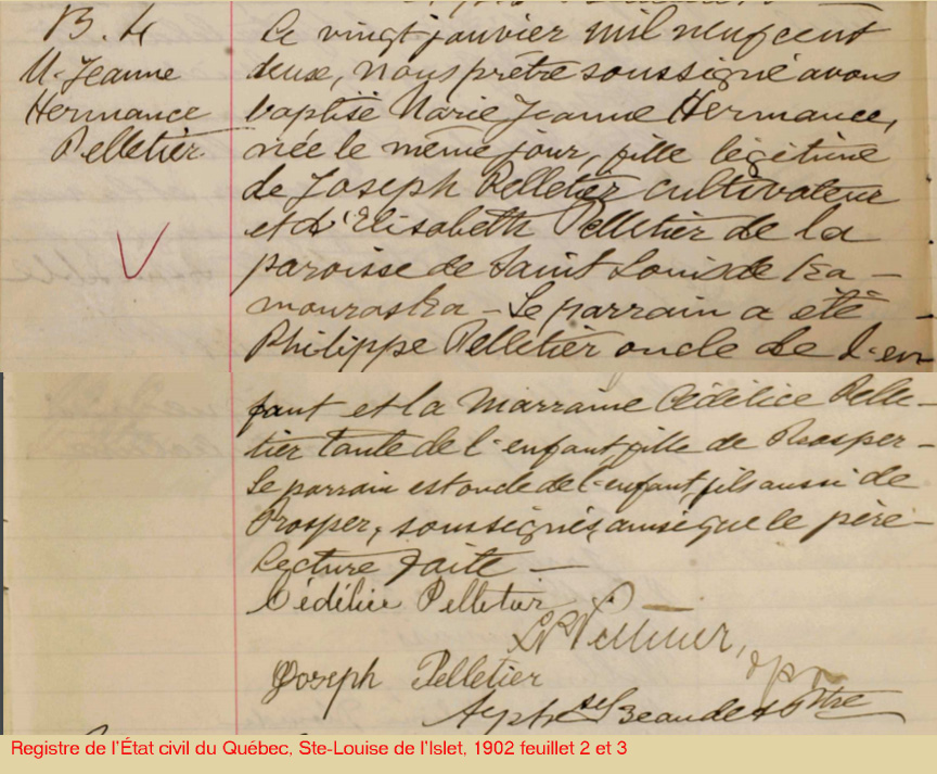 La Branche de Marie-Jeanne Pelletier N*1902 D*1996 Mariée à Albert Castonguay N*1897 M*1923 D*1945 Fille de Joseph Pelletier et Élisabeth Pelletier de St-Louis de Kamouraska, Québec. |