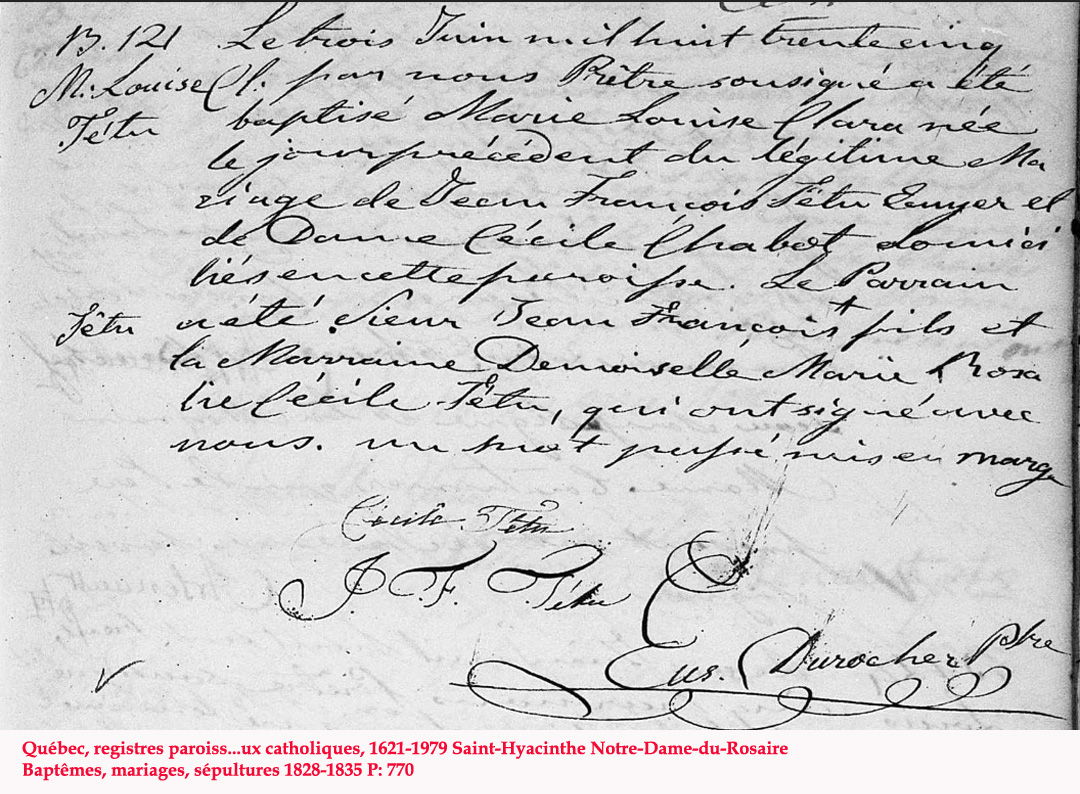 La Branche de Marie-Louise-Clara Tétu N*1835 D*1920 Mariée à Élisée Dionne N*1828 M*1852 D*1892 Ascendants |