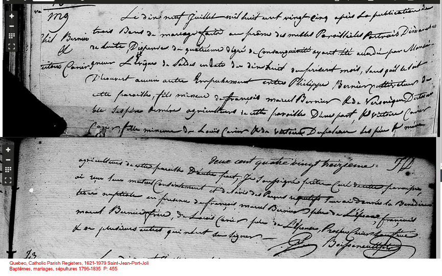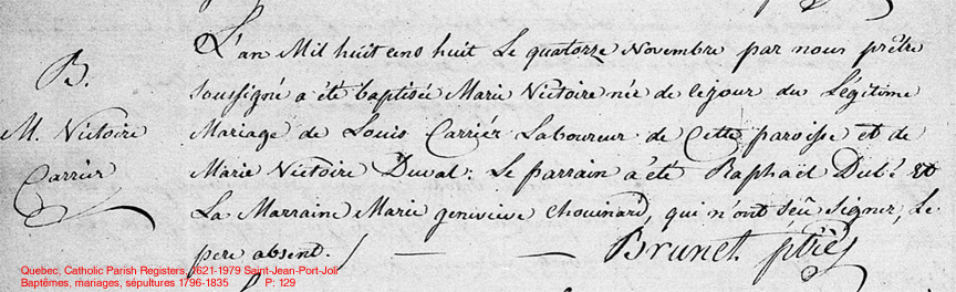 La Branche de Victoire Carrier N*1808 D*1870 Mariée à Philippe Bernier N*1802 M*1825 D*? Fille de Louis Carrier et Victoire Duval de St-Jean-Port-Joli, Québec. |