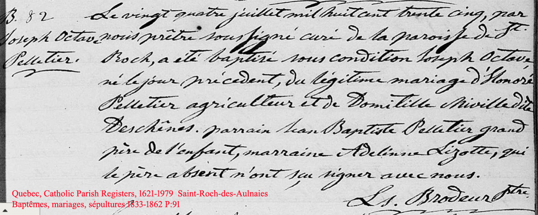La Branche de Honoré Pelletier N*1812 D*1861 Marié à (1) Domithilde Deschênes N*1810 M*1834 D*1837 Marié à (2) Priscille Lebel N*1818 M*1841 D*1845 Marié à (3) Thaïs Michaud N*1818 M*1847 D*1893 Ascendants |